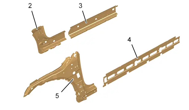 | (1) | Longeron extérieur section sous porte | 0,64 mm | Acier doux |