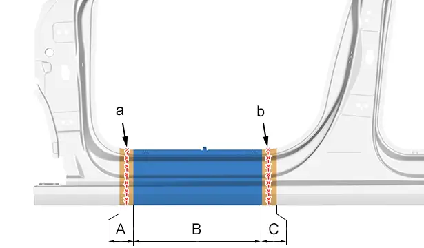 ATTENTION : Le nombre de points ou de cordons de soudure nécessaire à l’assemblage d’une pièce neuve doit être identique au nombre de points ou de cordons de soudure fixant la pièce d’origine.