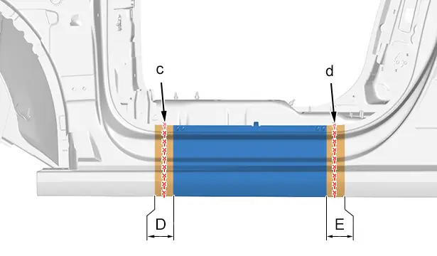 Les lignes de coupe "c" et "d" sont données à titre indicatif et peuvent évoluer selon les différents cas de remplacement du longeron extérieur section sous porte.