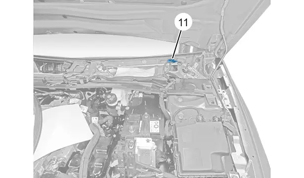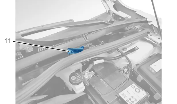 Une étiquette indiquant l’implantation du connecteur coupe-circuit (e-service plug) dans le véhicule est collée sur la plage du pare-chocs avant.