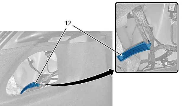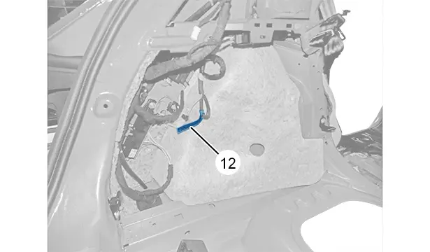 La boucle pompiers arrière est située sous la garniture latérale de coffre gauche et est identifiée par une étiquette spécifique. La garniture latérale de coffre gauche doit être arrachée pour accéder à la boucle pompiers arrière.