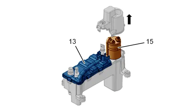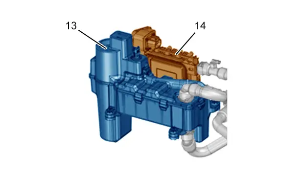 (14) Réchauffeur à eau électrique du circuit de chauffage.