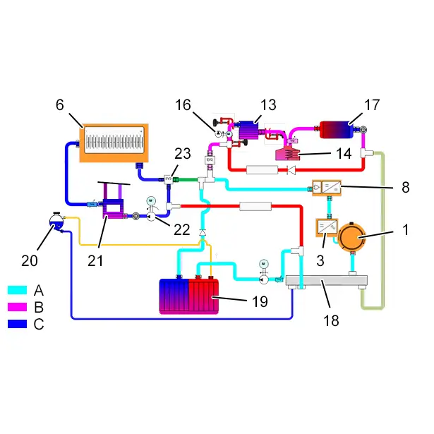Le condenseur à eau (13) permet l’échange de l’énergie dégagées lors de la condensation du fluide réfrigérant vers le circuit d’eau dédié au chauffage de l’habitacle.