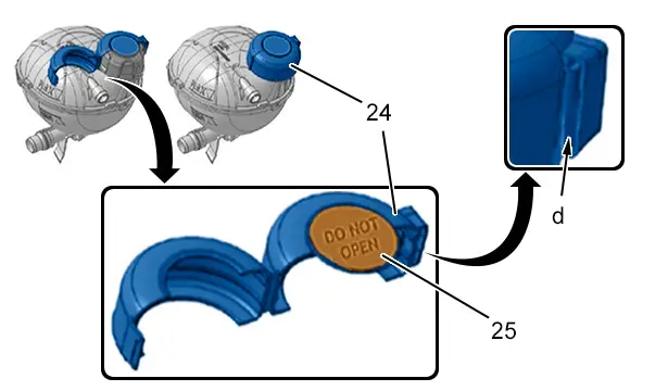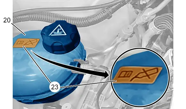 NOTA : Pour permettre au réseau d’analyser les éventuelles fuites du circuit et surtout les fuites internes dans le pack batterie, une étiquette interdisant au client de remettre à niveau le liquide de refroidissement a été apposée sur la boîte de dégazage.